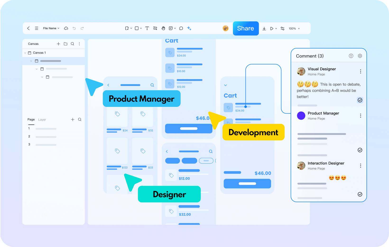 Prodes supports real-time threaded collaboration among team members, simultaneous editing and modification of prototypes, sharing of prototypes through one-click sharing, and rapid pointing and commenting on prototypes to quickly gather feedback